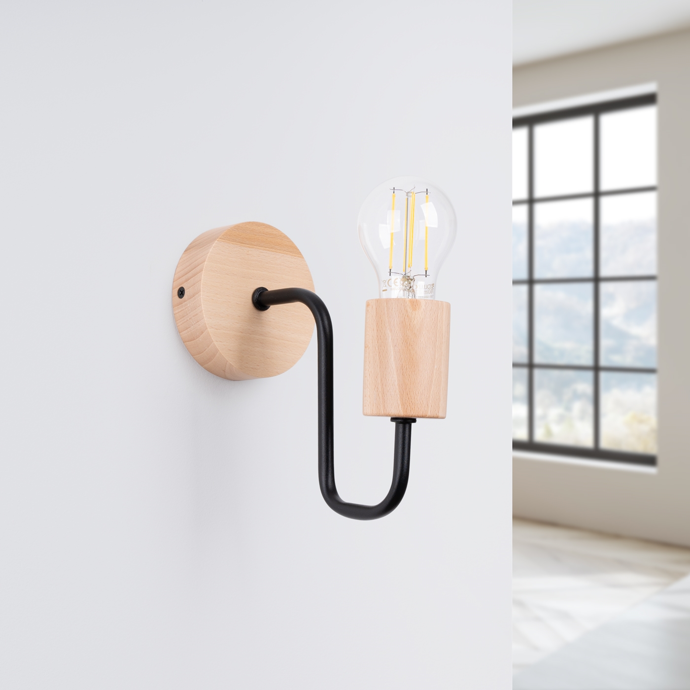 Czarno-drewniany kinkiet ścienny TIMBO wyróżnia się nie tylko designem, ale także precyzyjnym wykonaniem. Drewniane elementy zostały starannie oszlifowane, by zachować ich naturalną strukturę. Ramię kinkietu w kształcie odwróconej litery „U” dodaje całości lekkości i nowoczesnego charakteru, a jednocześnie pozwala na efektowne wyeksponowanie żarówki.